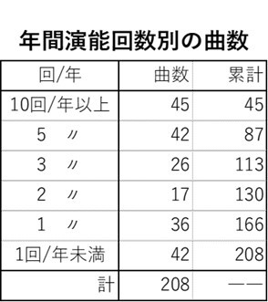 60年間の平均で、毎年10回以上公演された曲が45曲あり、5回以上は87曲あることが分かります。また、1年に1回の公演に満たない曲が42曲あることも分かりました。