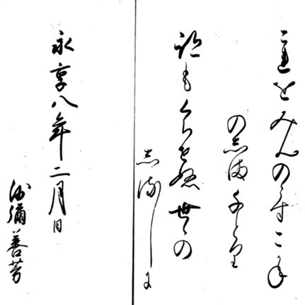 「これを見ん、残す黄金コガネの島千鳥、跡も朽ちせぬ世々のしるしに/永享八年(1436)二月日/沙彌善芳(世阿弥74才)」→「黄金の島の佐渡で書き残したこの筆の跡(金島書)は、朽ちることのない後世までの形見として、後代の人に見てもらえるであろうか」(「世阿弥・禅竹」1974刊・表章頭注参照。また、鳥の足跡を見て文字が作られたという中国古代の故事があり、古今集仮名序の結びに「鳥の跡、久しくとどまれらば…」もあります。ブログ子は筆跡に数々の謡本も含まれ、朽ちることなく後世に伝わることを望んだと拡大解釈しています。)