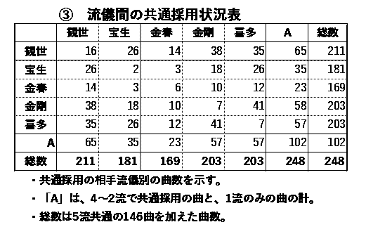 1.流儀独自の曲は、観世が16曲で一番多く、他流は7~2曲と少ない。観世の共通採用曲は、金剛とは38・喜多と35曲と多く、宝生とは26・金春とは14曲とやや少ない。