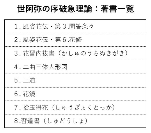 世阿弥が序破急について述べている文献は、部分的な言及個所を除いても次の8編があります。