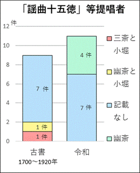 提唱者を記しているものは、300~100年前の古書9件の中では2件、令和では11件のうち4件だけでした。以上をグラフにすると次のとおりです。
