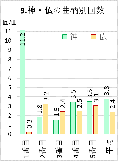 逆に、2番=男物と3番=女物では、神より仏の方が多くなっています。人間が主人公の曲では、身近で数多い神より、その本体である仏を頼って成仏を願うということのようです。