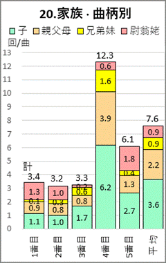 20.のグラフは家族を、「子」・「親+父+母」、「兄+弟+妹」・「尉+翁+姥」の4グループにして曲柄別に数えたものです。