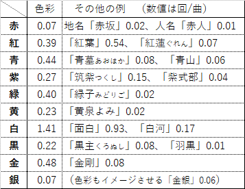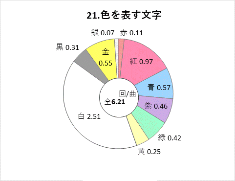 「白」以外で多い色は「紅」で、「赤」と合わせて1.1回になります。これに次ぐのが「青」の0.6回で、その他は0.5回未満となっています。