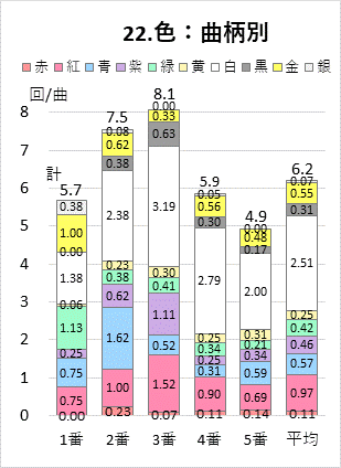 また、和の色として「桃・藍あい・錆さび・緋ひ・茶・鈍にぶ」も数えましたが、「桃」が0.12回、「藍」が0.06回で、「錆~鈍」は0.03回/曲以下で、非常に少なくなっていました。