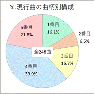 二つのグラフは、細かく見れば違いがありますが、一見しただけでは、同じように見えます。これは、146曲を分析すれば、全248曲を分析した結果とほぼ同じになることを示しています。従って曲柄別構成から見ても146曲の選定は妥当であると言えます。