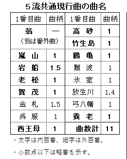 では、現行5流が共通して採用しており、今回のシリーズで分析対象曲とした146曲の曲名を示します。「翁」は特別な番外曲ですが1番目の表に入れ、曲柄別に50音順にしました。小数点以下の数字は略番です。太字は内百番、細字は外百番です。(曲柄・本籍・略番・内/外百番の詳細は外縁観測第1部を参照してください。)