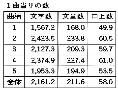 次の表は、1曲当りの数を示しています。
