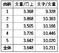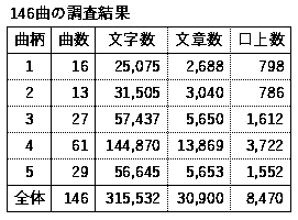 最初の表は、146曲について曲柄別の、曲数、文字数・文章数・口上数を曲柄別に計上しています。