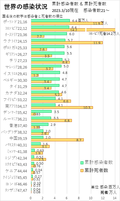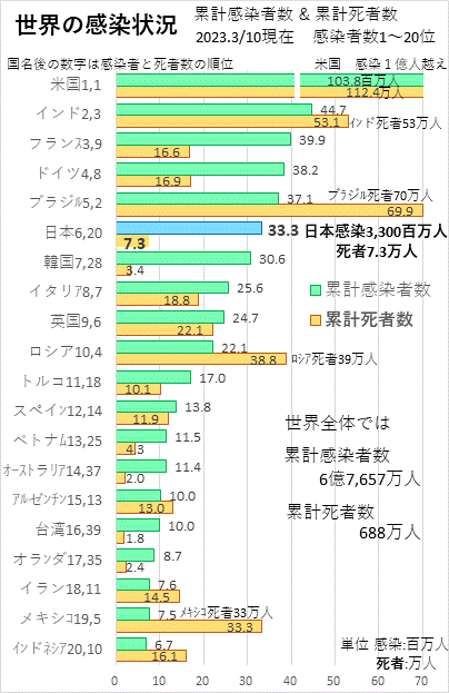 最初に2023年3月10日現在の世界の感染状況を示します。