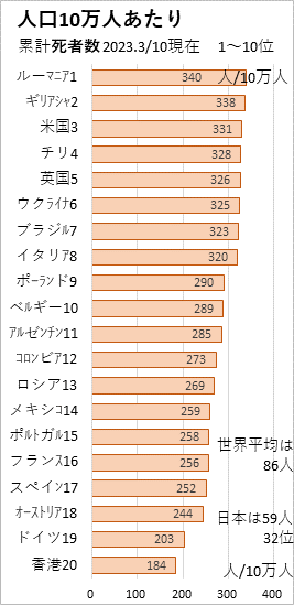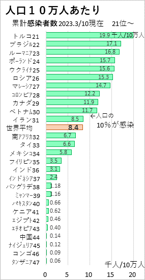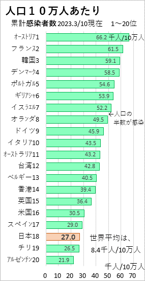 日本は人口が1億2330万人で、感染者が3320万人なので、10万人あたりでは2万7千人になります(27%に相当)。これは世界第18位で、世界平均の3.2倍になり、やや感染率の高い国となります。(2023.5/9朝日新聞の国内累計感染者数は、5/8現在で3380万2739人なので、27.4%になります。)