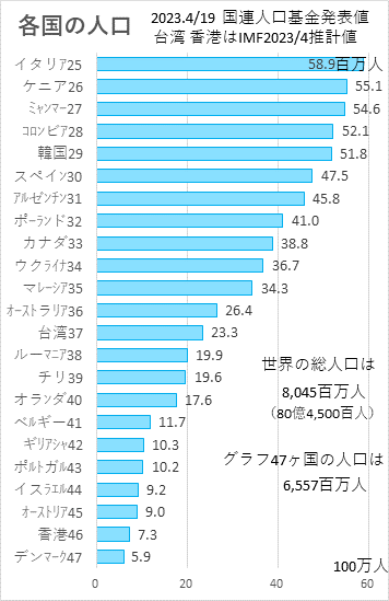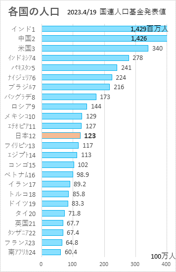 グラフの根拠となっている各国の人口をグラフで示すと次のとおりです。