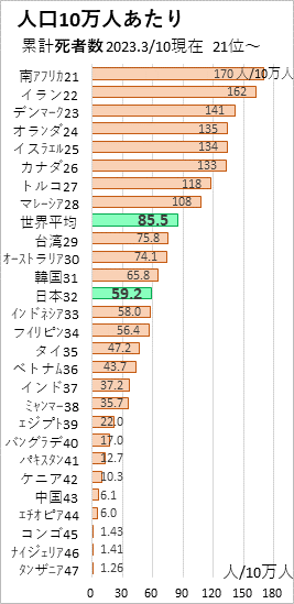 前回に続き、人口10万人あたりの各国死者数グラフは次の通りです。