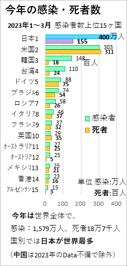 国別では日本が世界最多の400万人感染となっています。死者は155人です。