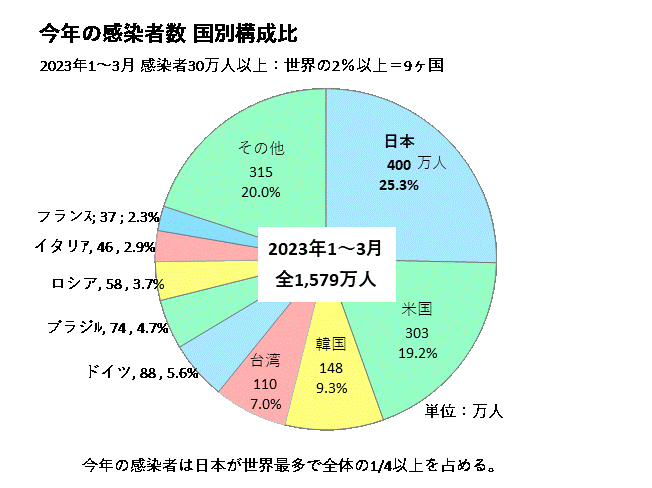 今年の年初2ヶ月余の感染者は、世界全体で1,579万人でした。これを国別構成で示すと次のとおりです。