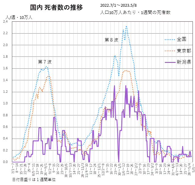 ②第8波の死者数は、人口あたりでみると明らかに東京より地方が多いが、新潟はやや少ない水準で推移した。
