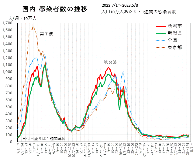 最初は感染者数の推移で、2022年7月から2023年5月の期間です。