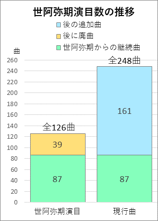 両者とも世阿弥伝書として申楽談義・五音・三道・三十五番目録を参照していますが、①には永享年間の演能記録、②には世阿弥の音曲口伝付記と建内記も挙げています。演目数は観世座以外を含めて、①表章126・②竹本117曲となり、世阿弥期の演目は観世座以外を含めて120曲前後と解して大きな違いはないようです。このうち87曲が現行曲となっており、600年前の演目の7割以上が現在に引き継がれていることになります。予想はしていても驚くほどの多さです。その後、曲目は増加し現行曲はほぼ倍増の248曲となっています。それでも全体の1/3強が世阿弥期の演目で占められているのです。この関係を図示すれば次の通りです。