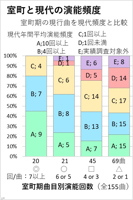 グラフから室町期に度々演じられ曲は、現代でも非常に良く演じられていることが分かります。室町期で7回以上演じられた20曲は、全曲が現代で毎年1回以上演じられ、その80%が毎年4回以上も演じられています。