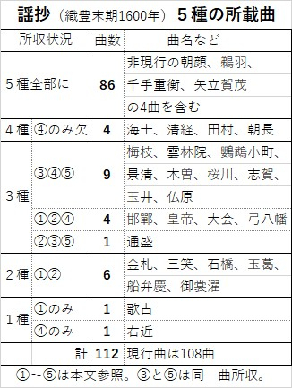 現行曲で見ると、5種全部に掲載が82曲;76%を占め、4種に記載が4曲;4%、3種に記載が14曲;13%、2種に記載が6曲;6%、1種のみ記載の曲が2曲;2%となり、3種以上に所載の曲が93%と大多数を占めています。