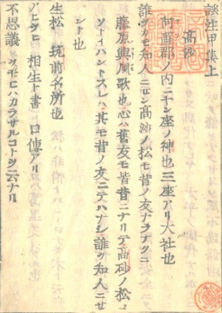 内容は謡曲の章句に細かな説明を付けています。注釈文は数文字で終わるものから、10行以上に及ぶ長文もあります。高砂で例示すれば、短いものは「不思議:オモヒハカラザルコトヲ云ナリ」などで、長いものは「始皇ノ御爵ニ預カル程ノ木也トテ:始皇ハ秦始皇帝也爵ハ位ノ義也位トハ官ノ類也始皇帝上奏山風雨暴至休於樹下因封其松為大夫史記本記ニアリ秦始皇泰山ニ上リ封禅ト云祭ヲスルソ積土為壇上ヲ髙メ壇ヲツイテ祭ルソ封ハ天ヲ祭ルヲ云ヒ禅ハ地ヲ云ソ始皇泰山ヨリ下ル時俄ニ風雨アル程ニ五本アル松ノ下ニ居テ雨ヲシノカレタ其恩賞ニ五本ノ松ヲ一本ツゝ大夫ノ官ニナサレタ是ヲ五大夫ト云也秦ニテ大夫ノ官ハ結構ナル官也秦ノ三公ハ丞相御史大夫大尉也唐ハ時代ニヨリテ三公ノ名替ルソ」などです。謡曲として比較的に短い高砂で、50前後の項目を立てて解説しています。版行本なのですが、版の種類によっては崩した草書があり、句読点や濁点のない古文で現代人には読みにくくなっています。しかし、中国の文献を引用するなど細かな説明を加えていることなどが読み取れます。
