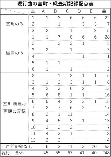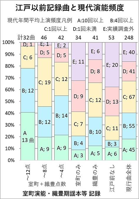 これに対し織豊期に記録がなく、室町期だけ記録の曲はA+Bが21%にとどまっており、現代で稀にしか演能されないDや、実績調査外の観世で非現行のEがそれぞれ30%前後もあります。