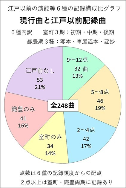 以上の配点により、現行248曲について江戸以前の演能等記録の構成比を、記録なしの曲とともにグラフで示すと次のとおりです。