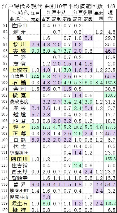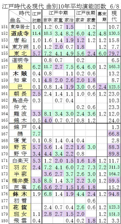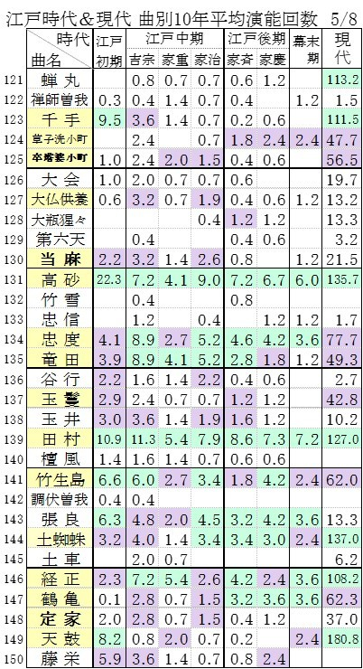 引き続き「江戸中後期&現代 曲別10年平均演能回数」をご覧になる場合は「謡曲の統計6」第5部-22を選択してください。