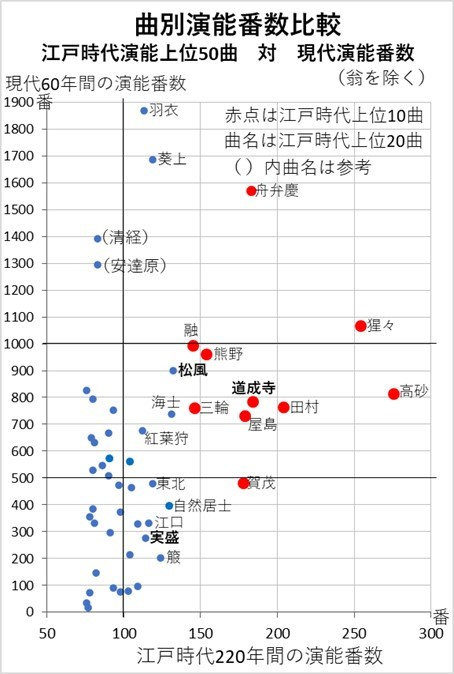 江戸のトップ20曲は、概ね現代の60年間でもよく演じられており、大部分の曲が現代で70位以内に入っています。外れるのは100位以内の「自然居士」「江口」「実盛」の3曲と「箙」の111位(60年間で203番の演能)となっています。