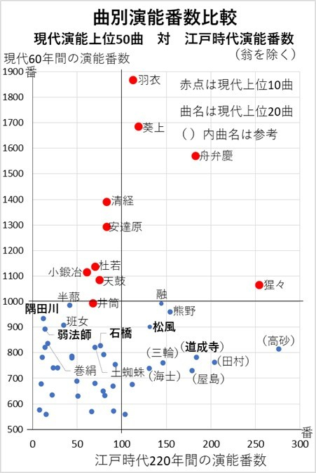 次に、現代の演能回数上位50曲(60年間で560回以上)について、江戸時代との比較を示します。