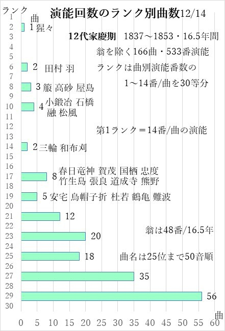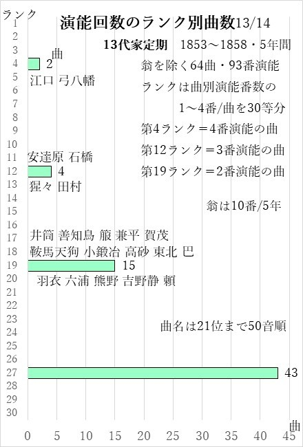 13代家定(1824~1858没)期は将軍在職が1853~1858年の5年間と短く、演能回数は前期の1/5以下に急減し、曲目も103番に減っています。曲別では「翁」の10回を除くと、1~4回の演能だけになっています。グラフでは上位曲を21位まで載せましたが、これまでの上位曲と同じには扱えないので、次の家茂期と合わせて比較することとします。
