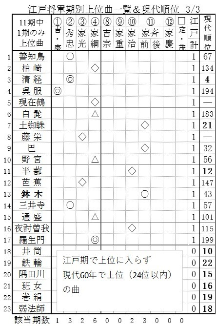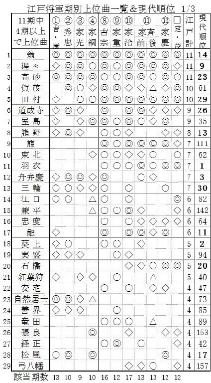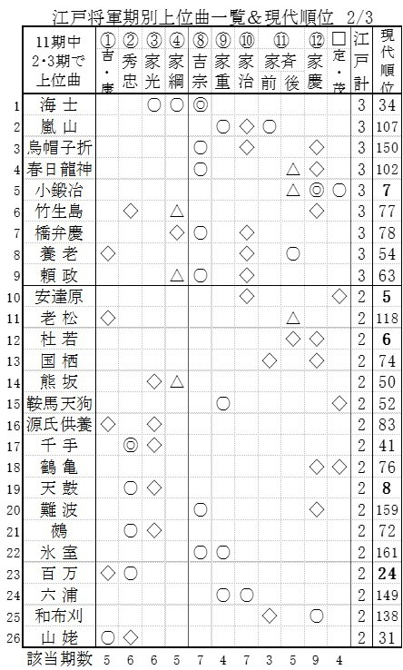 次に、江戸全11期中で、3または2回上位曲となった曲の表を示します。
