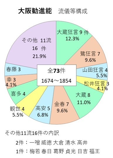 では、大阪での勧進能一覧(①~④)を掲げます。参照資料は、A能楽盛衰記(池内信嘉著1925大正14初版・1992平成4東京創元社復刻増補版・解題等西野春雄)265頁の「大阪町奉行の通達による勧進能・狂言」、およびB観世文庫(観世アーカイブ整理番号54/65宗:Web)の「大阪勧進能順」の二つです。Aには59件、Bには36件の勧進能を載せていますが、22件は重複しているので73件の一覧となります。なお、Bの資料は達筆で記されているため一部読取が不正確になっているかも知れません。そしてBは、解題で70件とあるのですが初期(1680延宝8~1772安永元年の93年分・34件)の画像が確認できませんでした。また、興行月は実際の番組より早くなっているものが少なくないと記し、江戸時代前期から大阪で開催されていたいわゆる大阪勧進能は、シテ方以外の公儀御役者に認められていたと解題に記しています。