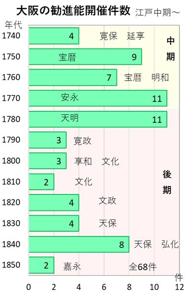 この68件の開催頻度をグラフで示しておきます。年号は寛延(1748~1751)期間が短く該当の勧進能がないので記載を省略しました。なお、開催日数は5~7日間興行と思われますが詳細は不明のため、日数グラフは省略しました。