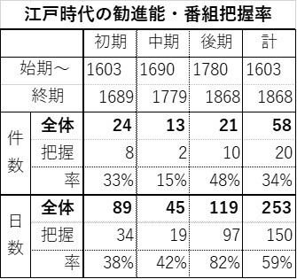 全体で58件・253日のうち、件数では34%、日数で59%の番組が把握できたことになります。時期別では後期(特に幕末)の把握率が高く、日数で82%にもなっています。約200年前と、さらにそれ以前とでは古記録の把握に差が出るのはやむを得ないところと思います。