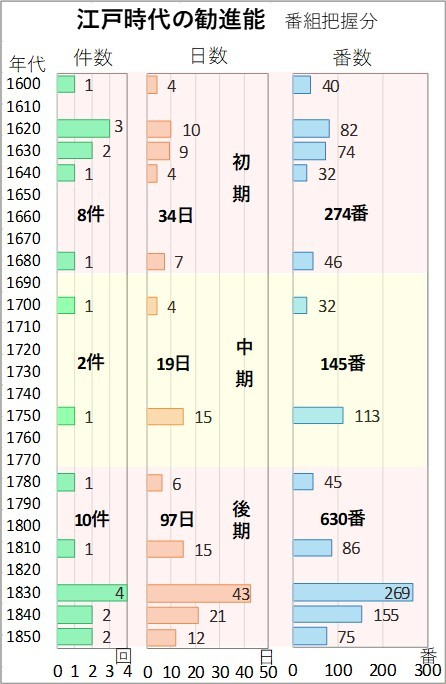 第8部-1のグラフに比べると、江戸中期の勧進能が少なく幕末が多いなど共通していますが、初期の番組把握が少なくなっています。古記録に頼る限界が現れているようです。