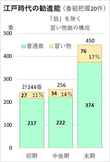次のグラフは番組の曲目を、習い物曲とその他の一般曲の構成で示したものです。但し「翁」は全体番数からも、習い物の番数からも除いてあります。また、習い物曲は現行観世流での分類によっています(他流でも大切にされている曲となっています)。