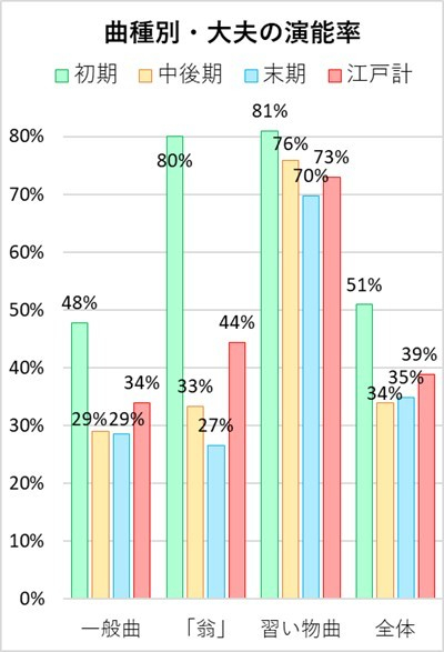 このグラフで顕著なことは、習い物曲を大夫が演ずる割合が70~81%を占め、その他の曲に比べて非常に多いことです。勧進能を行う場合に、花形役者の大夫が舞う名曲・名作を看板にするのは当然なことと思われます。逆に「翁」は大夫独占になっていると思われましたが、グラフからは初期を除けば一般曲より少し多い程度になっています。「翁」が頻繁に演じられた江戸時代と現在では、「翁」に対する認識が大きく違っているようです。