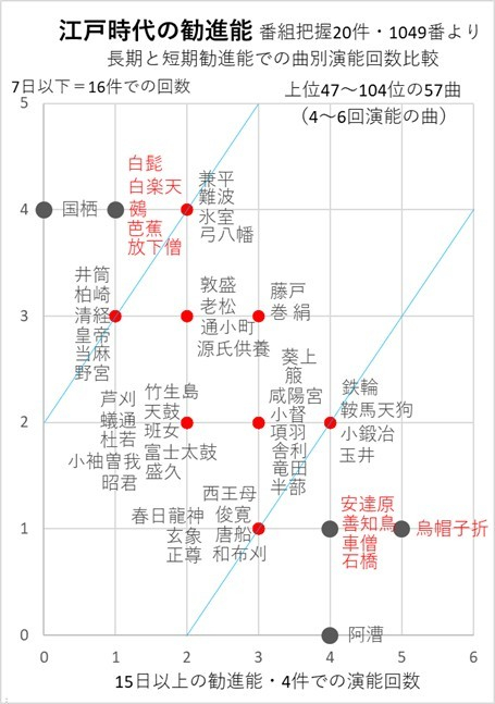グラフの右上は、短期と長期の勧進能のどちらでも非常に多く(最大19回=猩々・船弁慶)演じられた曲です。左下は、どちらでも多く(最小7回=羅生門など)演じられましたが、右上に比べると、やや少なく演じられた曲となっています。