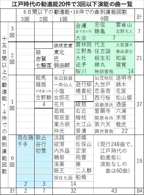 最後に、江戸時代の勧進能で演能回数が3回以下と低迷した84曲の曲名を表にします。