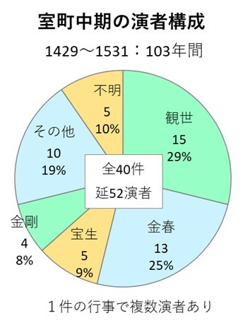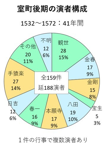 このグラフでは、いわゆる大和系四座の観世・金春・宝生・金剛が全体の7割強を占めています。その他19%の多くは手猿楽と見られ、日吉や矢田の名も見えます。