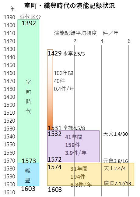 能楽源流考での演能記録は、世阿弥の活躍した室町初期の38年間に回数データのない事が再確認できます。また、上のグラフのように、天文年間(1532)以前はその後の記録頻度の1/10しかありません。