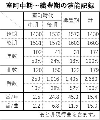 以上で室町・織豊時代の演能回数データの整理が出来ましたので、次回は、2026.1/31に第9部-7「江戸・明治の演能データ」を掲載する予定です。