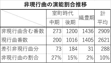 現行曲と非現行曲を区別して得たデータではなく、間接的に求めた数値からの表ですが、室町中期には非現行曲が3割近くも演じられ、室町後期にはほぼ半減し、織豊期には2%となっています。曲目の自然淘汰で名曲が厳選されてきたものと思われます。また、前節の手猿楽の説明のように、中期から手猿楽が盛んとなって様々に演能されたことも影響しているようです。