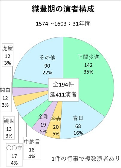 織豊期の演者構成は、前節の室町後期から一変しています。大和系四座はグラフでその他扱いとした宝生の6回を合わせても半減して14%強に留まります。
