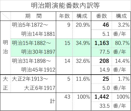 この統計を数え上げると1163番(非現行曲を除く)になります。また、統計欄以外の記述で番組紹介の頁もあり、早くは江戸末期の1817文化14年から、最後は1917大正6年にまで及んでいます。これらの演能番数を期間別の表にすると次のとおりです。(文化14年の20番は除きました。)