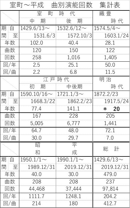 次に、各期間の演能曲目数と合計演能番数をまとめて示しておきます。(2026.3/26に修正しました。)但し、予め次の点にご留意ください。